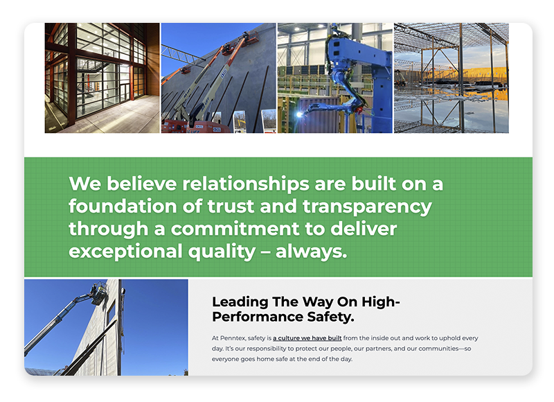 High-quality photography and video content highlight both the scale of Penntex’s projects and the people behind them, reinforcing the team-driven culture that sets the company apart. The site was also designed with flexibility in mind, enabling Penntex to easily showcase new projects and keep content fresh as the company continues to grow.
